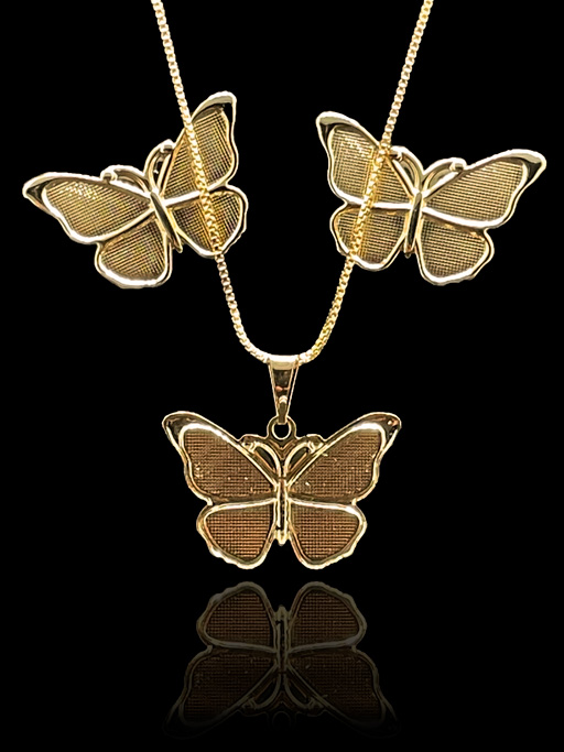 Conjunto de Brincos e Corrente com Pingente em formato de Borboletas. Joia banhada a 10 milésimos de ouro legítimo 18 quilates.
